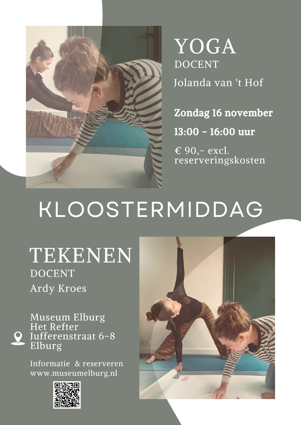 Op zondagmiddag 16 november vindt de eerste Kloostermiddag plaats van 13:00 - 16:00 uur. Voor deze middag werken yogadocent Jolanda van 't Hof en kunstenares Ardy Kroes samen. Beide zijn ook bekend binnen Museum Elburg. Meer informatie, uitleg over het programma en reservering van jouw plek tref je via de link https://www.museumelburg.nl/vvv-specials/kloostermiddag-yoga/