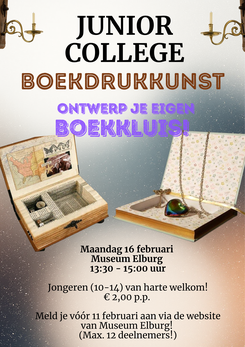 Op maandag 16 februari 2026 organiseert Museum Elburg een Junior College Boekdrukkunst voor jongeren van 10-14 jaar. De activiteit duurt van 13:30-15:00 uur en begint met een korte introductie over boekdrukkunst: de jongeren leren wat drukletters zijn, hoe ze te gebruiken en hoe ze te combineren met kleur en decoratie. Vervolgens gaan ze zelf aan de slag met hun uitgeholde boeken.