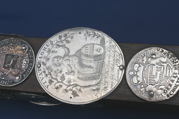 Daarnaast bezitten we ook zilveren penningen die op de notenhouten scepter bevestigd zitten, deze werd vaardig gehanteerd door de overman van het Schipluidengilde. De penningen waren geschenken van de gildevoorzitters waarvan er één penning toebehoorde tot een lid van de familie van Oldenbarnevelt. Een andere penning behoorde toe aan Willem Anne van Spaen la Lecq, hij was van 1769 tot en met 1795 bijna onafgebroken burgemeester van Elburg. Hij mocht zich ook lid van de Eerste Kamer en president van de Hoge Raad van Adel noemen.