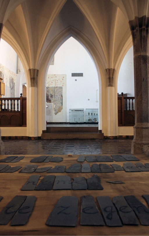 Jenna Tas maakt veel gebruik van leisteenscherven, die zij symbool laat staan om omgebrachte joden. Met die scherven creëert zij op meerdere wijzen grafmonumenten voor mensen die zonder naam en zonder gezicht zijn gedumpt in massagraven of waarvan, nadat zij in de gaskamers om het leven waren gebracht, de as in grote kuilen is gegooid. Hen was niet eens een eervolle begrafenis gegund, zij telden niet mee en werden niet gezien als mensen. Hen wil Jenna Tas op deze wijze postuum die eer nog bewijzen. Door het invoeren van een combinatieticket voor de tentoonstelling in de Sjoel en de beide exposities in Museum Elburg ontstond zo een logisch verhaal.