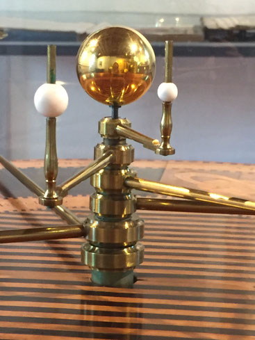 Het eerste college gaat over sterrenkunde. Hierbij wordt de verbinding gemaakt met een topstuk uit onze collectie, namelijk het planetarium, eind 18e eeuw vervaardigd door Hertog van Laun. Het betreft een planetarium op hoge tafel met inlegwerk, van eiken bindhout met mahonie onderstel, blad gefineerd met hulst, ebben, Honduras mahonie en esdoorn, waarop planeetarmen met bolletjes van verschillende grootte om de banen van de planeten om de zon aanschouwelijk te maken. Prachtig natuurlijk, maar hoe werkt zo’n planetarium nu eigenlijk?
