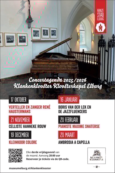 Klankenklooster is een initiatief van Museum Elburg, maandelijks terugkerend op de 3e vrijdagavond van de maand, veelal in de Kloosterkapel. In het Klankarchief ziet u welke concerten er al geweest zijn. De meeste beginnen om 20.00 uur, u bent dan vanaf 19.30 uur van harte welkom via de ingang Trouwzaal in de Zuiderwalstraat. Bestel uw kaartje van te voren online of koop deze bij aanvang van het concert voor € 20,00 (inclusief een pauzedrankje). Annuleren van een boeking kan tot uiterlijk dinsdagavond 21.00 uur voorafgaande aan desbetreffend concert. De boekingskosten worden niet teruggeboekt. Annuleert u na dinsdagavond, dan worden de kosten van de tickets niet teruggestort.